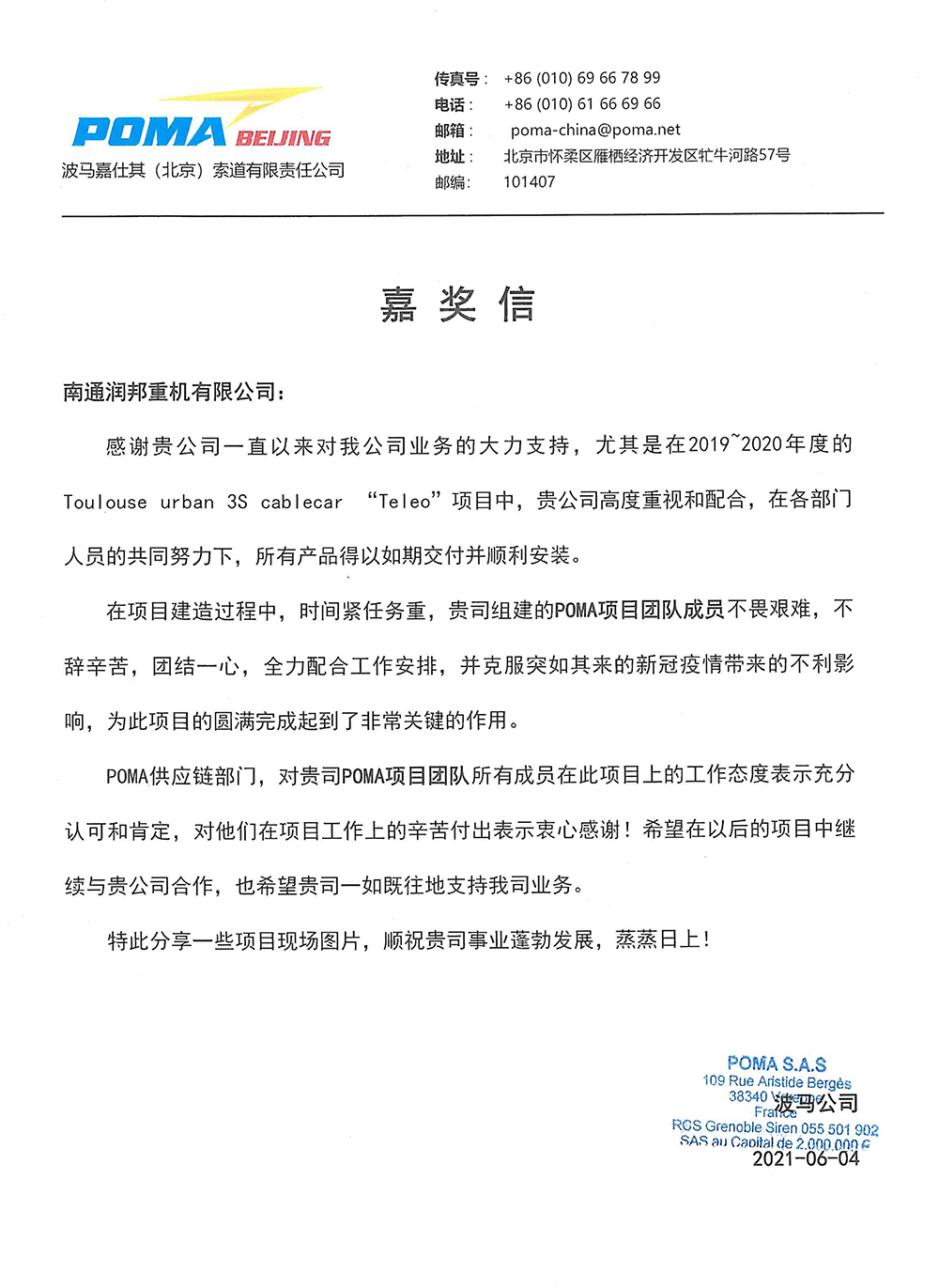 近日,潤邦重機收到了一封來自客戶的嘉獎信。信中,POMA法國總部對潤邦重機在項目履約中所體現出的專業高效的業務能力和盡職盡責的服務精神給予了大力贊揚。在此之前,潤邦重機承建的“POMA 圖盧茲塔架項目”作為歐洲特色交通建設的樣板工程迎接了法國總理一行的參觀視察,并得到了政府部門的充分肯定,此項目成為了公司踐行“完美履約”理念的又一生動例證。