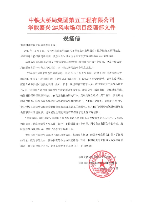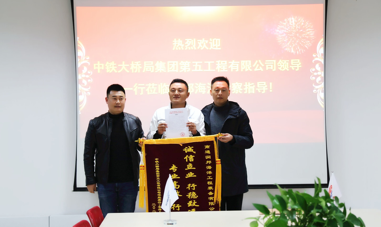 近日,中鐵大橋局集團(tuán)第五工程有限公司領(lǐng)導(dǎo)蒞臨潤邦海洋,特意送來“誠信立業(yè)、行穩(wěn)致遠(yuǎn);專業(yè)高效、行業(yè)龍頭”的榮譽(yù)錦旗及感謝信,高度稱贊潤邦海洋在雙方合作的“華能嘉興2#風(fēng)電場項(xiàng)目”上表現(xiàn)出的頑強(qiáng)拼搏、精益制造的生產(chǎn)服務(wù)理念。潤邦海洋常務(wù)副總經(jīng)理邵夕吾等熱情接待了中鐵大橋局集團(tuán)的客人。