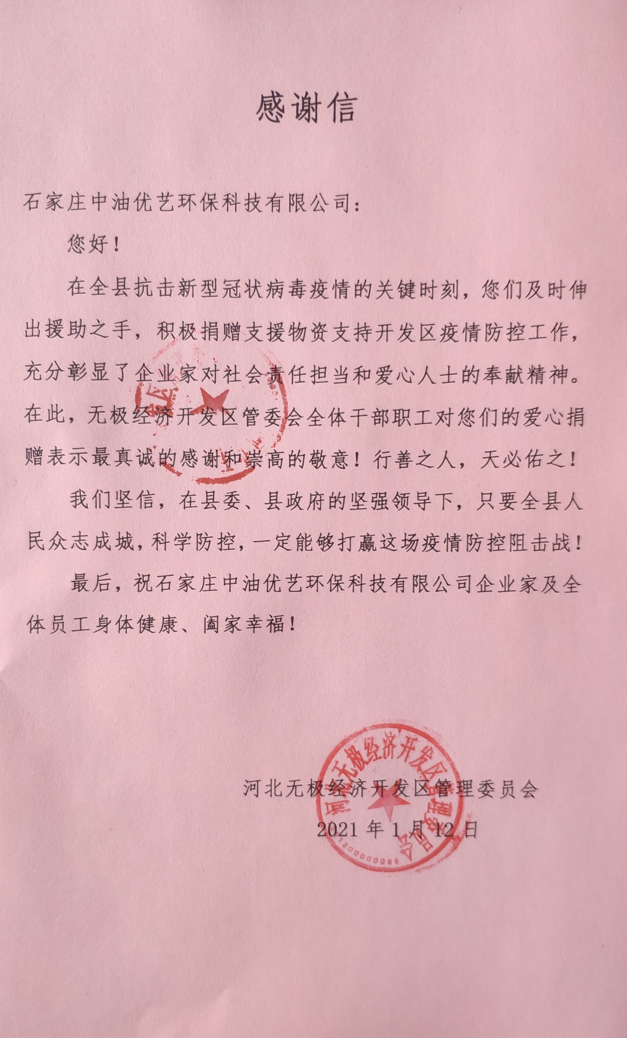 疫情阻隔了空間的距離,卻阻擋不了愛心的匯聚和真情的問候。歲末年初,疫情肆虐河北大地,牽動(dòng)著全國人民的心。疫情發(fā)生后,公司旗下中油環(huán)保石家莊公司積極應(yīng)對(duì),配合政府各部門做好防疫工作,為打贏疫情防控阻擊戰(zhàn)貢獻(xiàn)自己的力量。