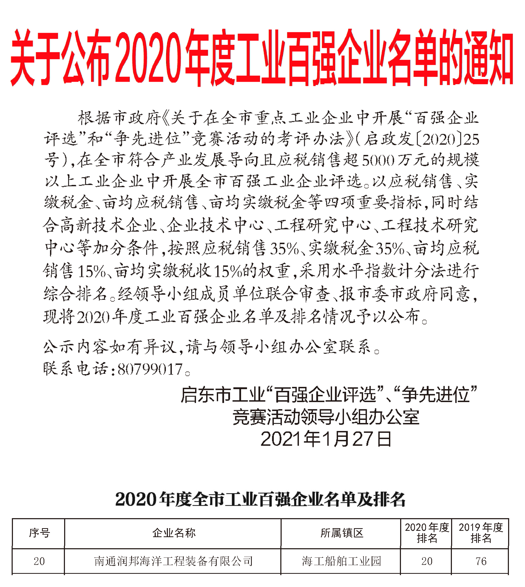 近日,江蘇省啟東市政府發布《2020年度全市工業百強企業名單及排名》,潤邦海洋成功入選并排名第20位,在海工船舶園區排名第3位,相比“2019年度工業百強企業”第76位的排名,本次潤邦海洋排名前進了56位。