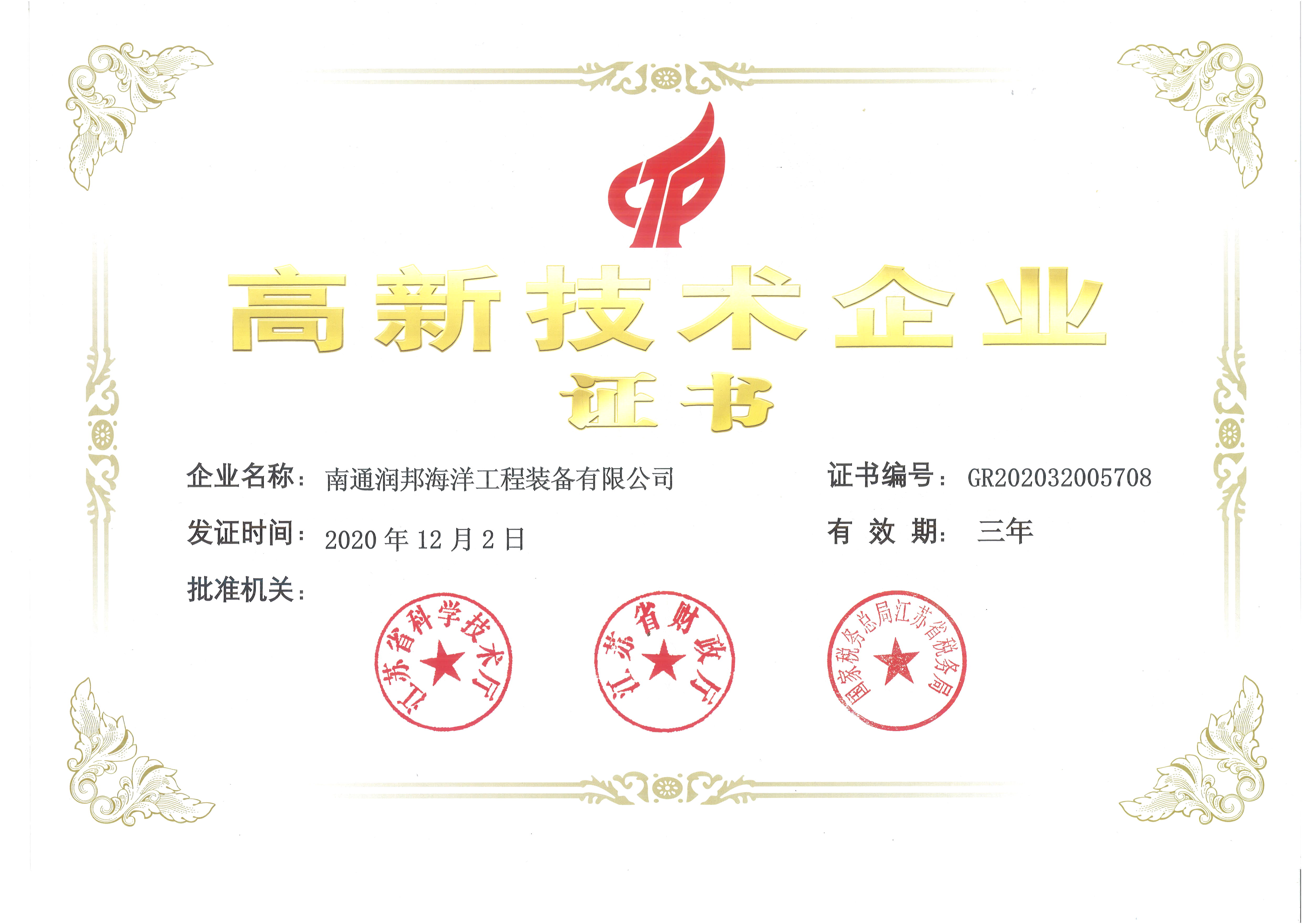近日,潤邦海洋獲江蘇省科學技術廳、江蘇省財政廳、國家稅務總局江蘇省稅務局聯合頒發的《高新技術企業證書》,這意味著公司正式通過了高新技術企業的認定。